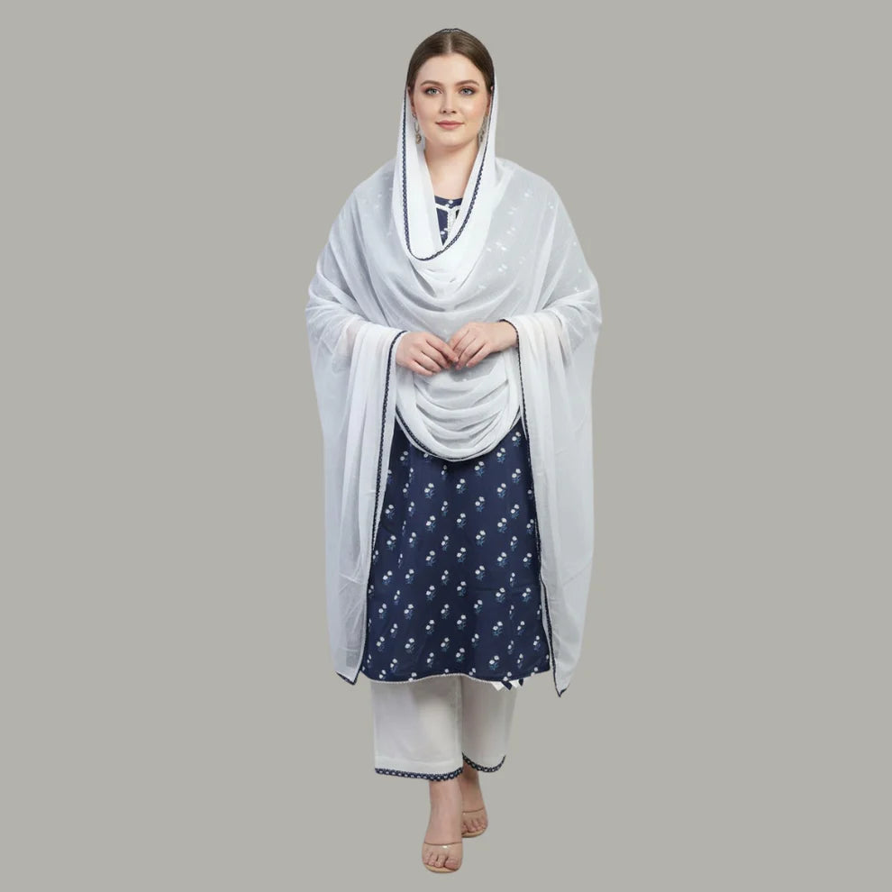 Add grace to your summer wardrobe with the Neel Kamal 3-piece lawn suit, blending traditional detailing with modern simplicity. This navy blue lawn shirt is adorned with subtle white floral prints and finished with gota lace edging on the neckline, sleeves, and hem for a refined touch of elegance.